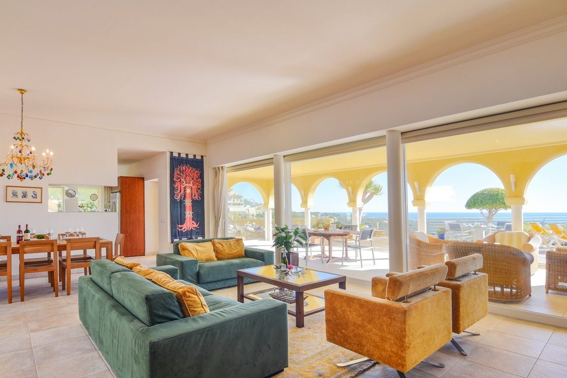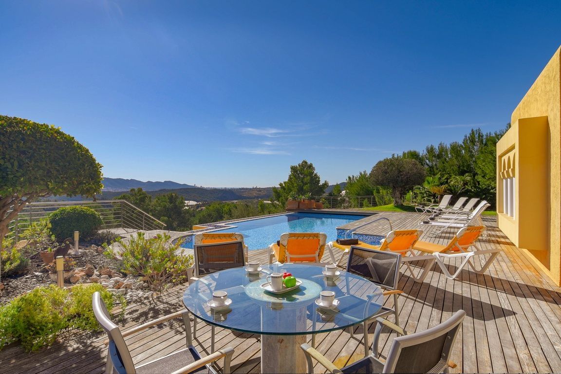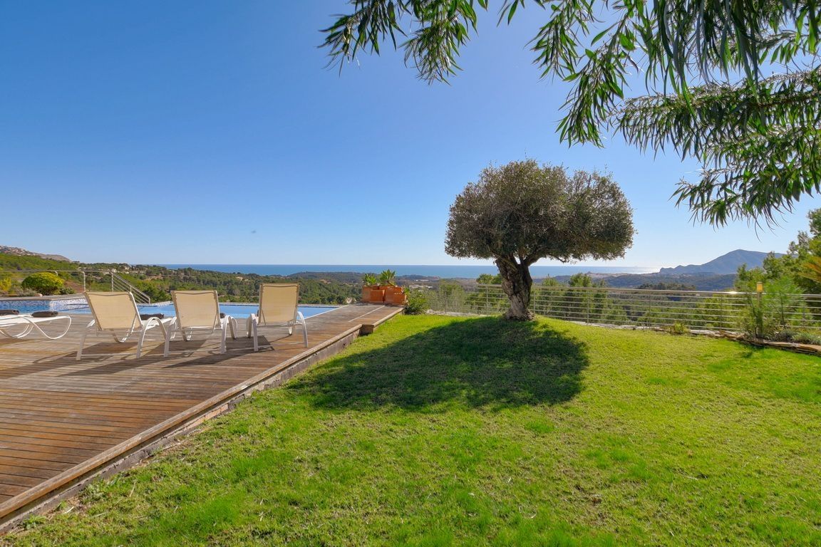 This villa of 371 sqm has a guest apartment with 3 bedrooms, 2 bathrooms, living room with open kitchen, the rest of the house has 4 bedrooms, 4 bathrooms, large living room where you can enjoy views of the garden, pool and sea, large equipped kitchen, alarm, satellite, etc.. The garden has several seating areas, barbecue area, private pool, parking spaces, garage, quiet area and 15 minutes from the beach.
