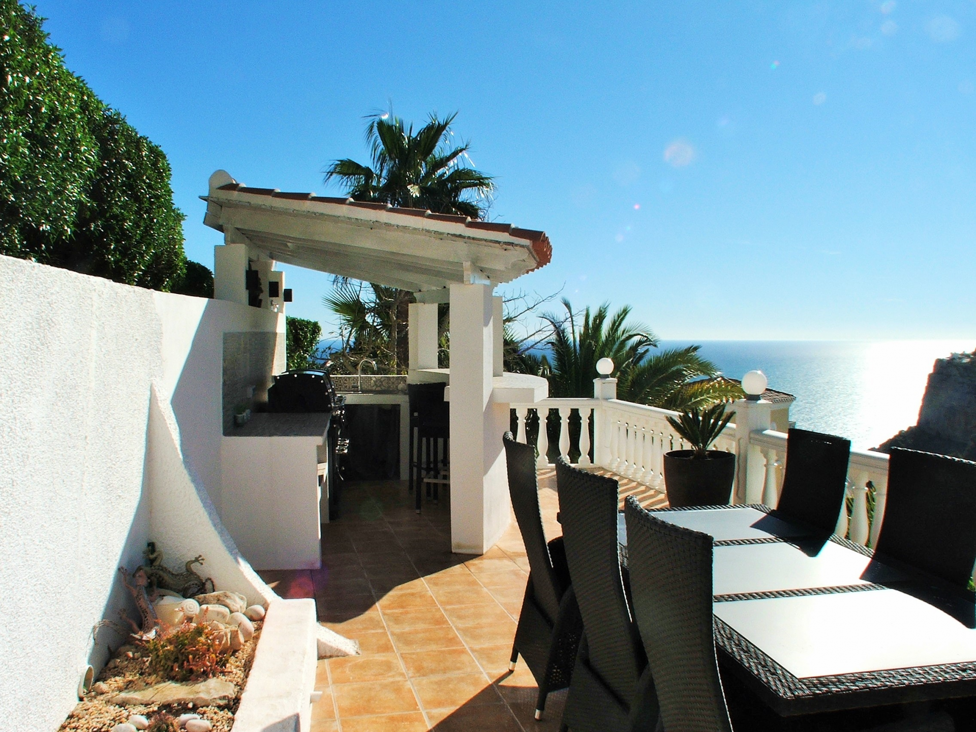 A well designed villa of 340 M2 for sale with panoramic sea views. The villa is finished to a high standard and has been recently refurbished.The main living area has two bedrooms with the master bedroom having access to the terrace with stunning sea views. There is a new, modern kitchen and outside there are a number of terraces, one with an outdoor kitchen and all with panoramic sea views. There are three more bedrooms and two bathrooms downstairs with a separate entry to a one bedroom apartment. The villa has air-conditioning and central heating throughout and the south facing location gives the villa sun all day.